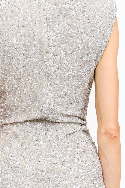 SEQUIN SHOULDER PAD MINI DRESS - Hand wash cold - Do not bleach - Line dry - Iron low if needed - Do not tumble dry Model is 5'11" and is wearing a size small